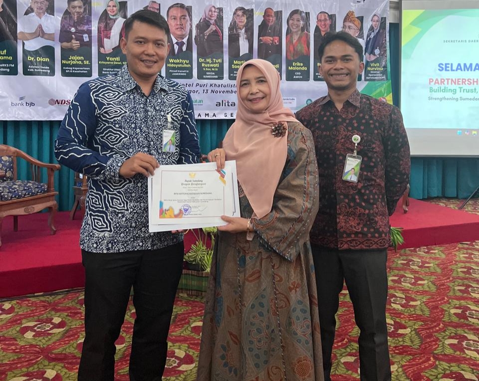 Penghargaan tersebut diserahkan langsung oleh Sekertaris Daerah (Sekda) Sumedang, Hj. Tuti Ruswati kepada Kepala Bidang Kepesertaan BPJS Ketenagakerjaan Sumedang
