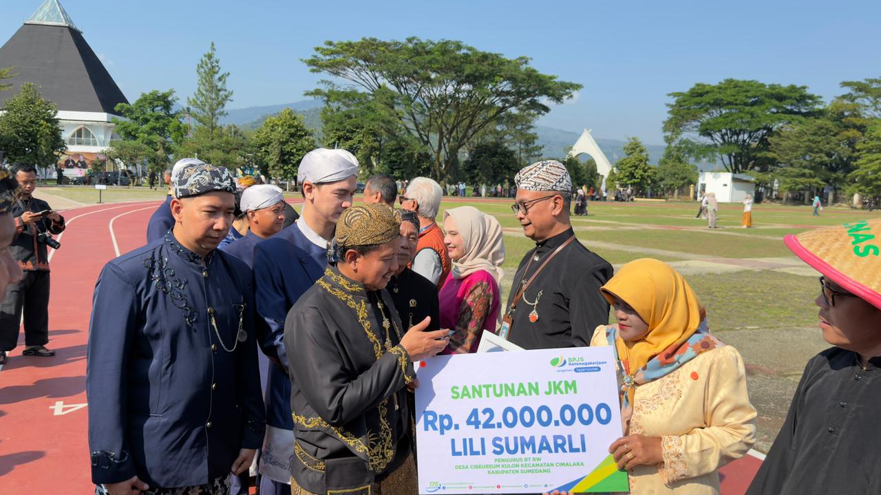 SUMEDANG – Dalam rangkaian Upacara Peringatan Hari Jadi Sumedang (HJS) ke-448, Pemerintah Daerah Kabupaten Sumedang menyerahkan santunan Jaminan Kematian (JKM) sebesar Rp42.000.000 kepada ahli waris peserta, Senin (20/4/2026).