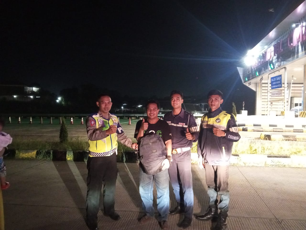 “Saat itu kami menemukan 3 orang pemudik pengguna jalan tol Cisumdawu di KM 183 jalur A sedang berjalan kaki dibahu jalan. Setelah dilakukan pengecekan dan perbincangan ternyata yang bersangkutan sedang mencari tasnya yang terjatuh di bagasi mobilnya saat melintas dari arah Bandung menuju Jateng. Tas itu, berisi surat-surat penting dan barang-barang berharga,” ujarnya.