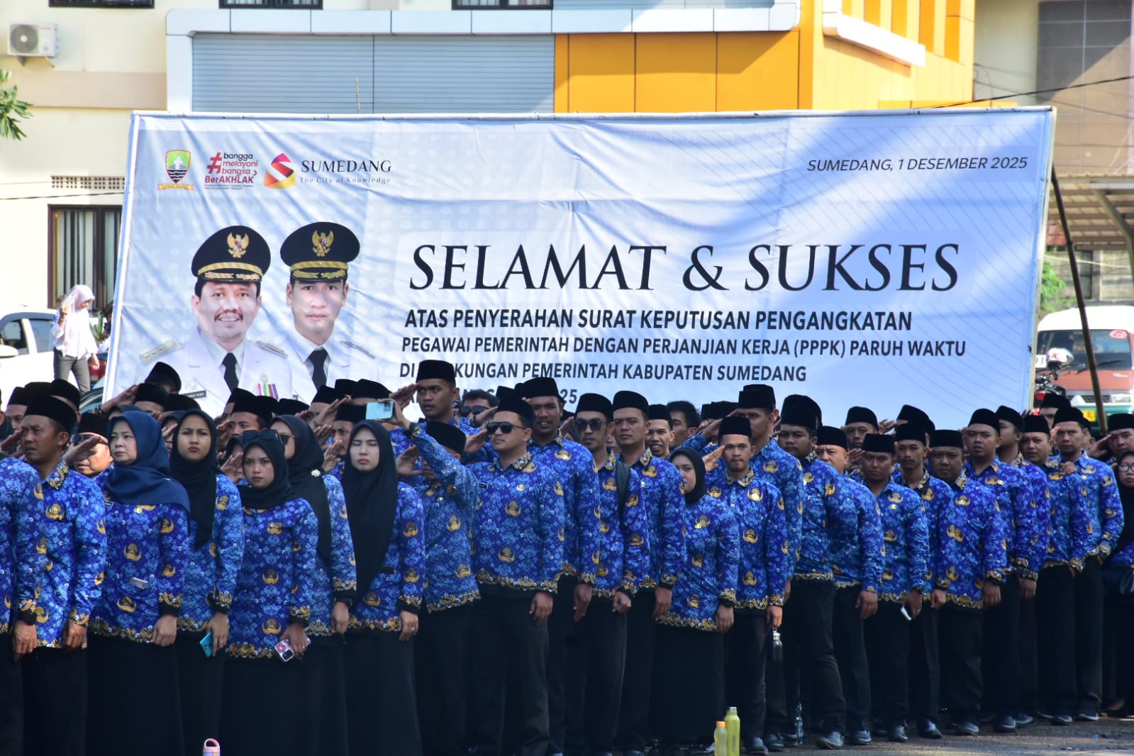 SUMEDANG – Sebanyak 5.408 Pegawai Pemerintah dengan Perjanjian Kerja (PPPK) Paruh Waktu menerima Surat Keputusan (SK) pada Upacara Peringatan Hari Ulang Tahun (HUT) KORPRI ke-54 Tahun 2025, di Pusat Pemerintahan Sumedang, Senin (1/12/2025).