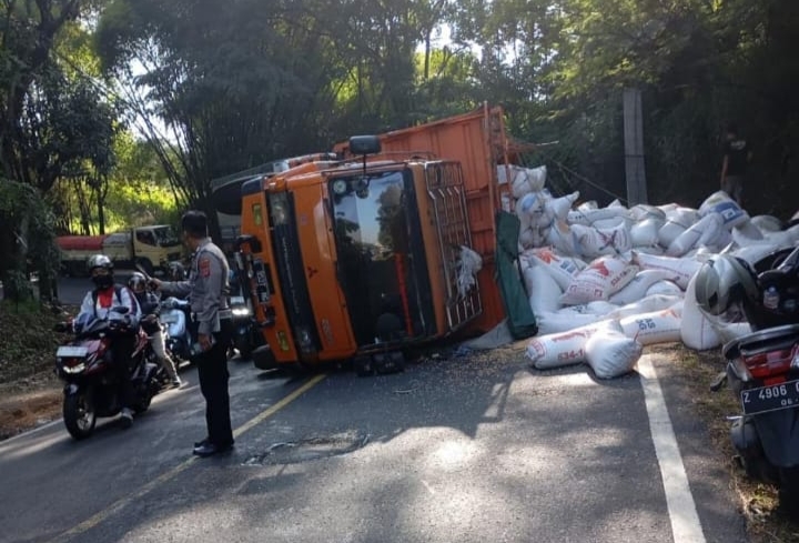 SUMEDANG, 14 Juni 2025 – Sebuah truk Mitsubishi Fuso Nopol E 8537 MG bermuatan gabah terguling di Jalan Raya Ir Soekarno, tepatnya di Dusun Cikuda, Desa Hegarmanah, Kecamatan Jatinangor, Sabtu (14/6) sekitar pukul 08.00 WIB.